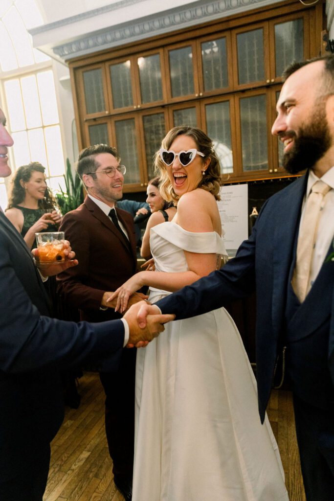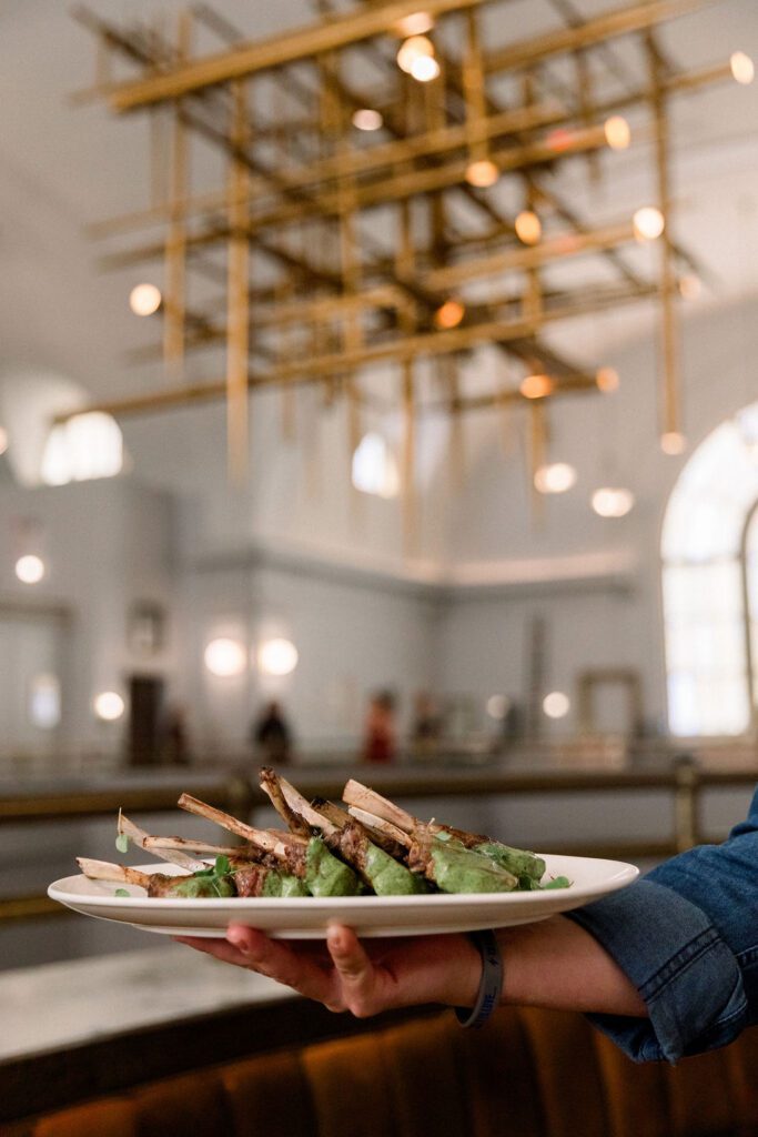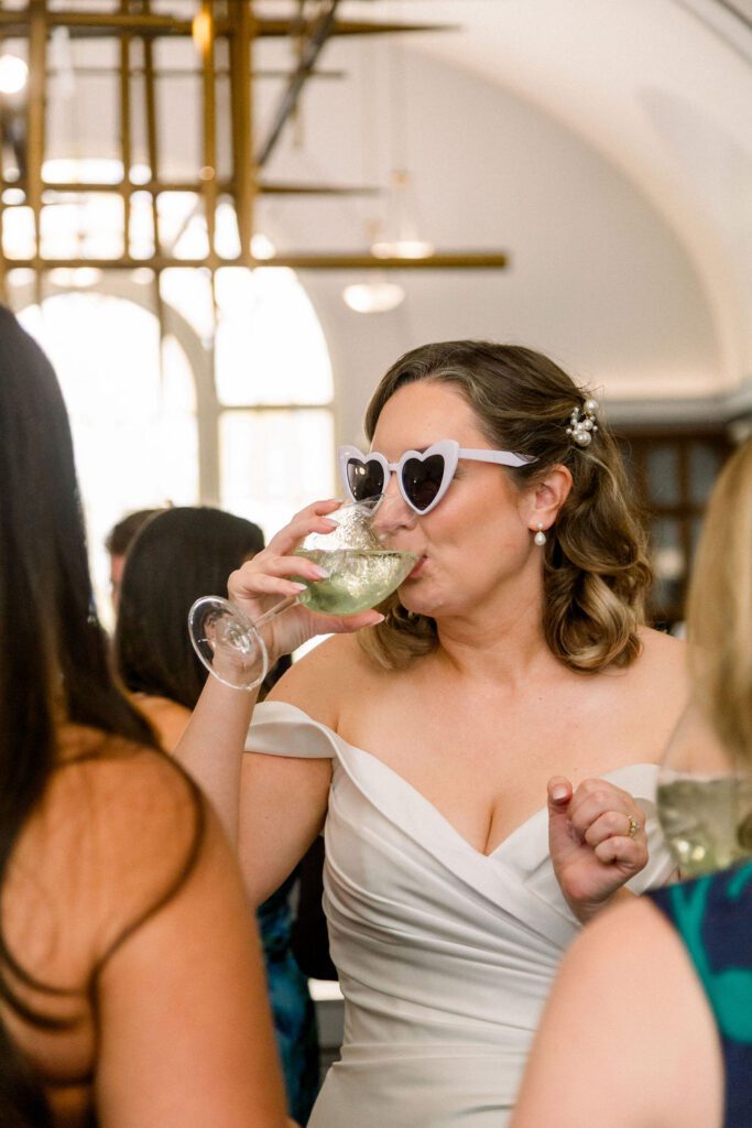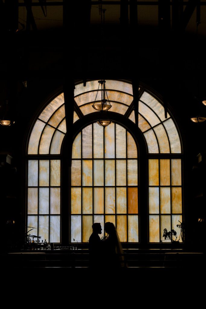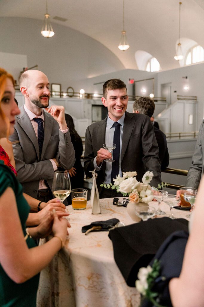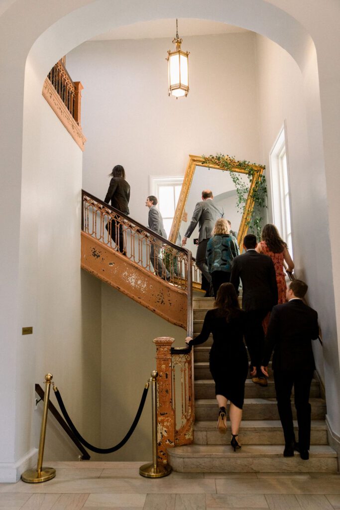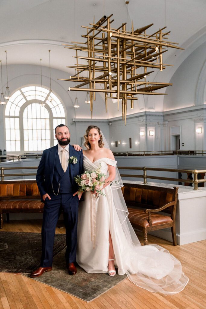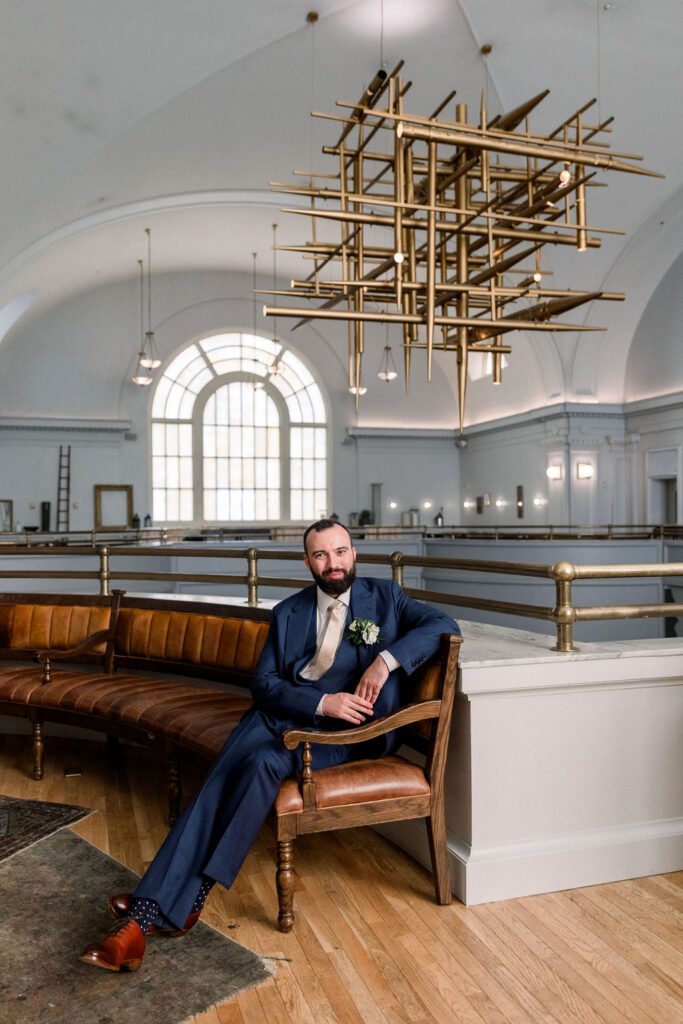 Following the ceremony, the guests made their way down to the Mezzanine for cocktail hour. This space overlooks the hotel cafe and bar and features one of the coolest structures, a chandelier made from organ pipes from the old church.