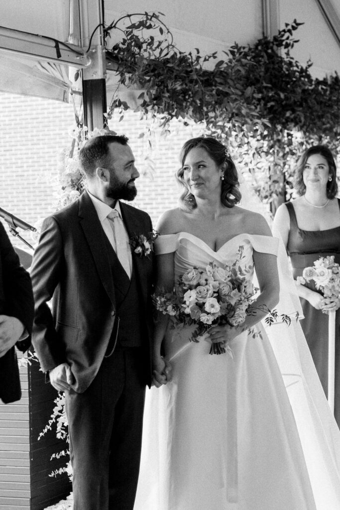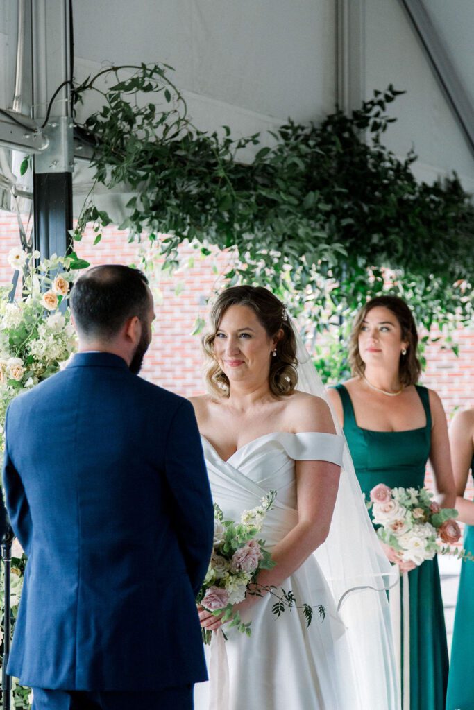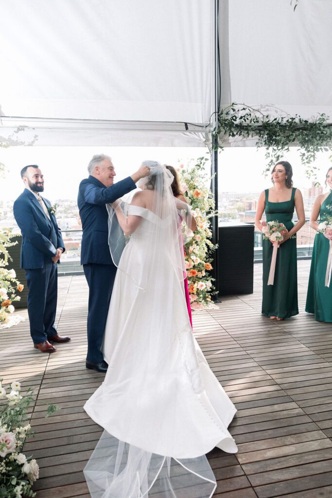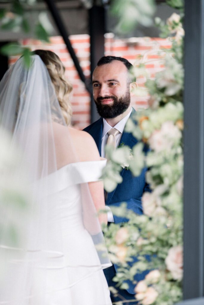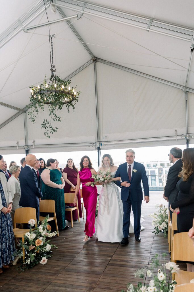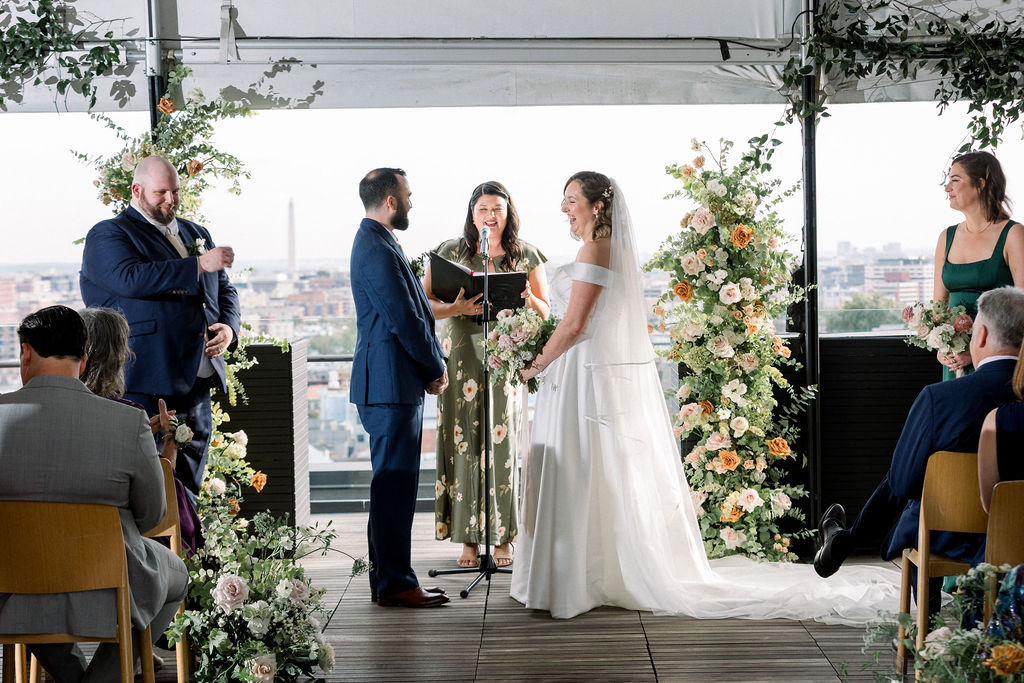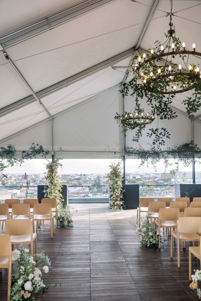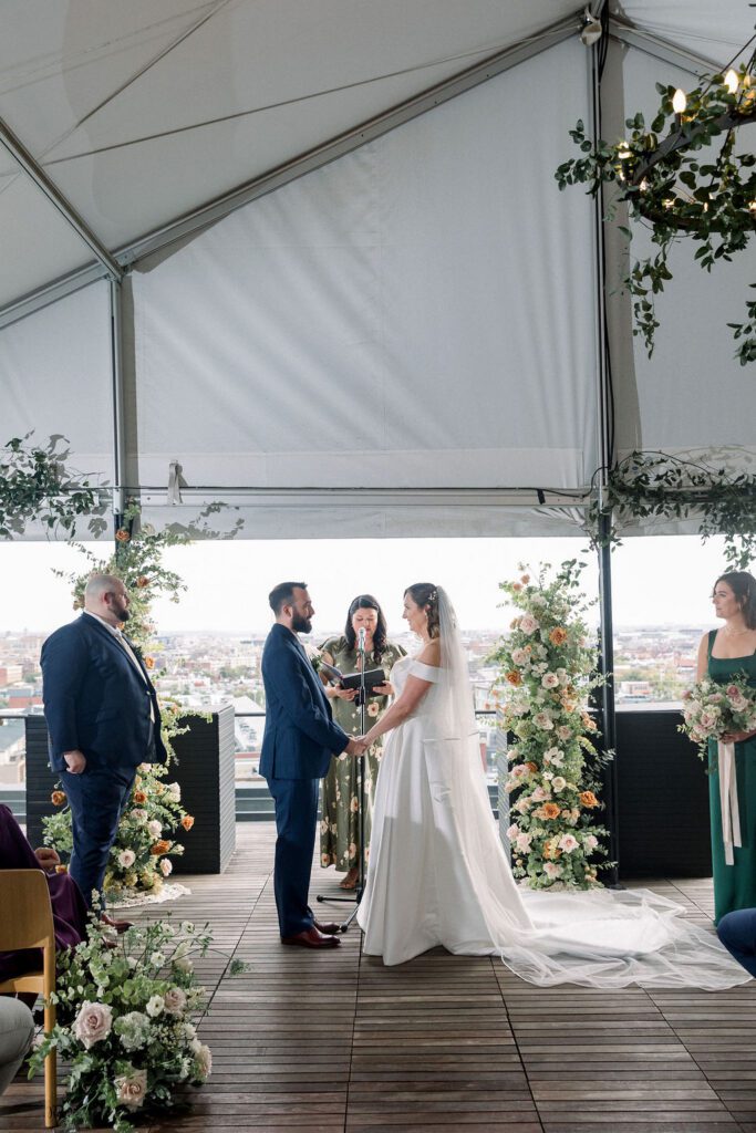 Their wedding was on the rooftop underneath the permanent tent, with the chandeliers adorned with greenery and flowers to soften the space. Their friend officiated their ceremony, which was probably the sweetest and funniest ceremony I’ve ever heard.