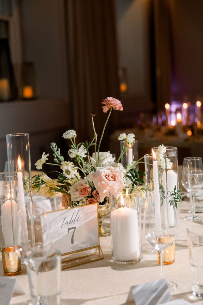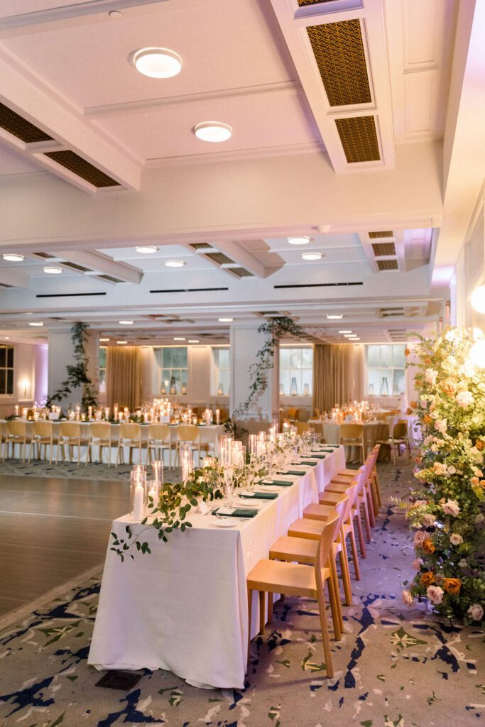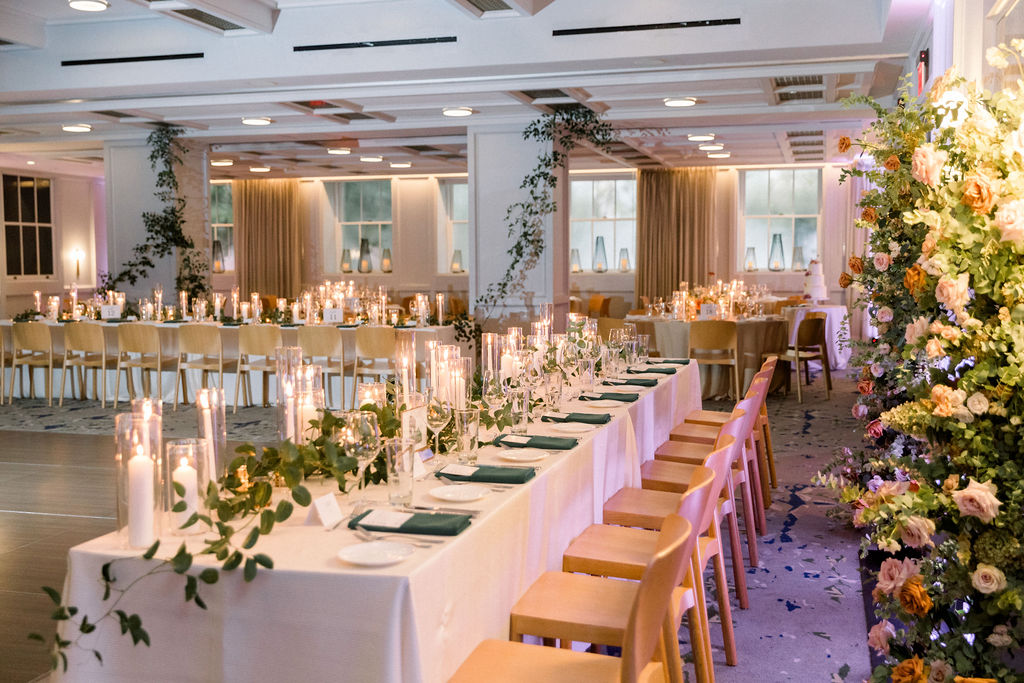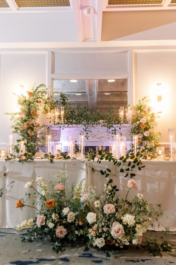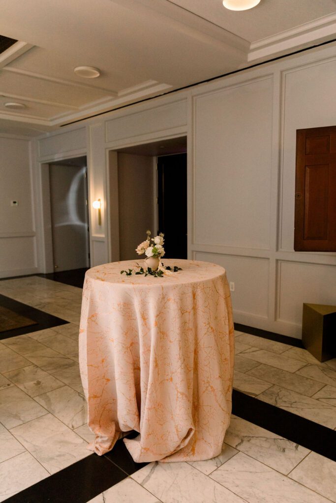 Getting married in the Fall in October, they wanted to slightly nod at fall within the design, but lean into the fun architecture of the Line, and soft colors of the summer. Their flowers included blush pink, soft oranges, and lots of greenery.