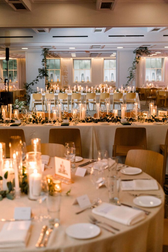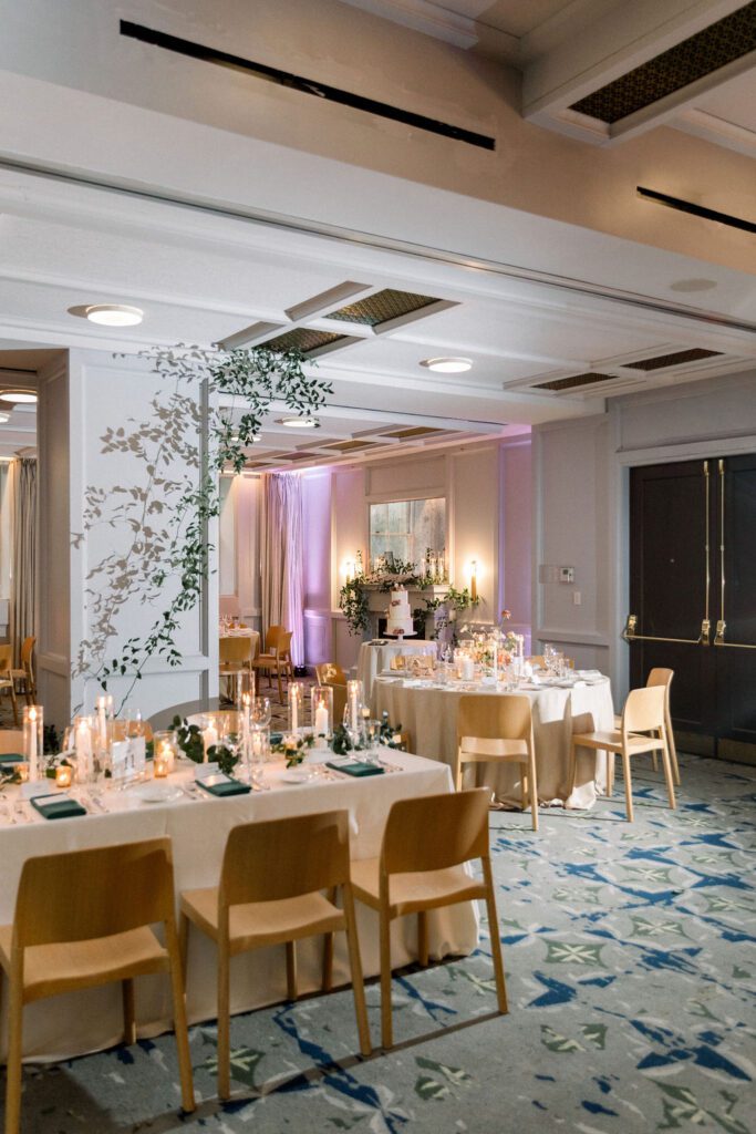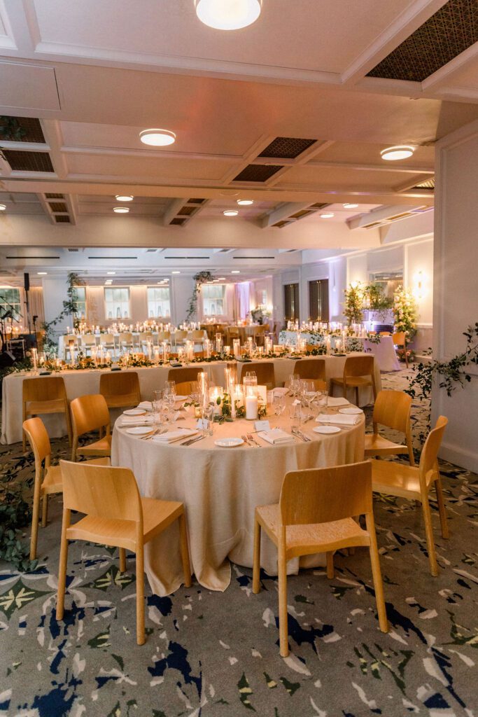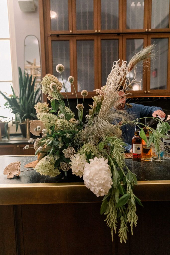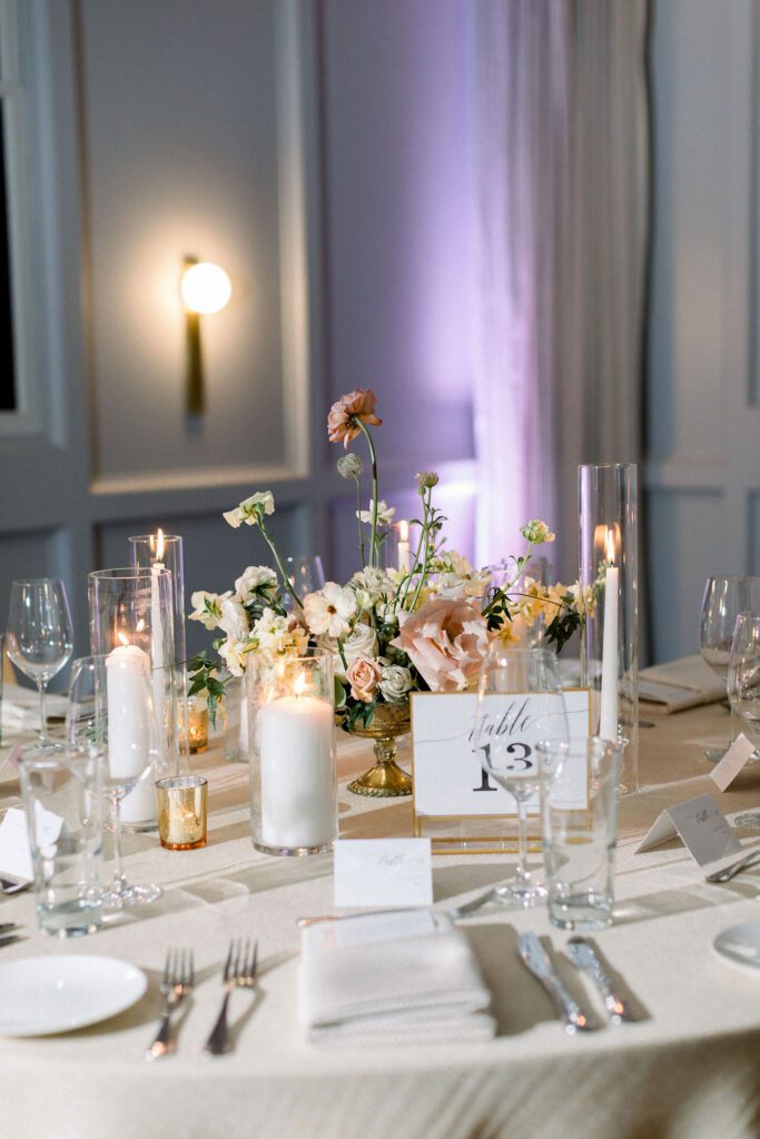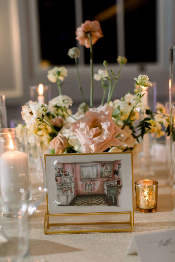 Getting married in the Fall in October, they wanted to slightly nod at fall within the design, but lean into the fun architecture of the Line, and soft colors of the summer. Their flowers included blush pink, soft oranges, and lots of greenery.