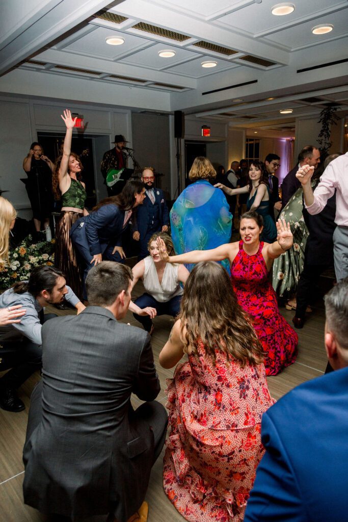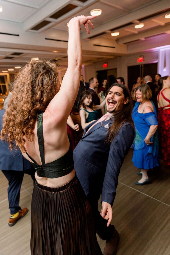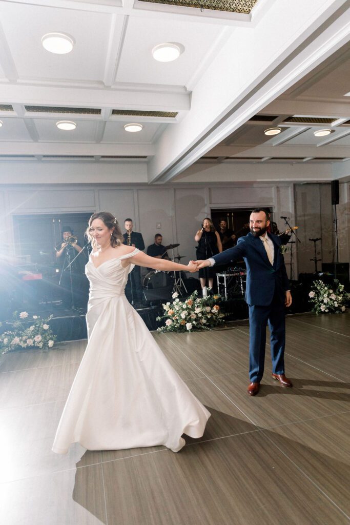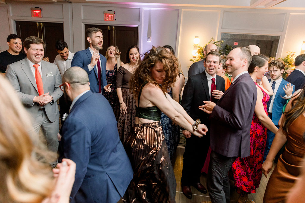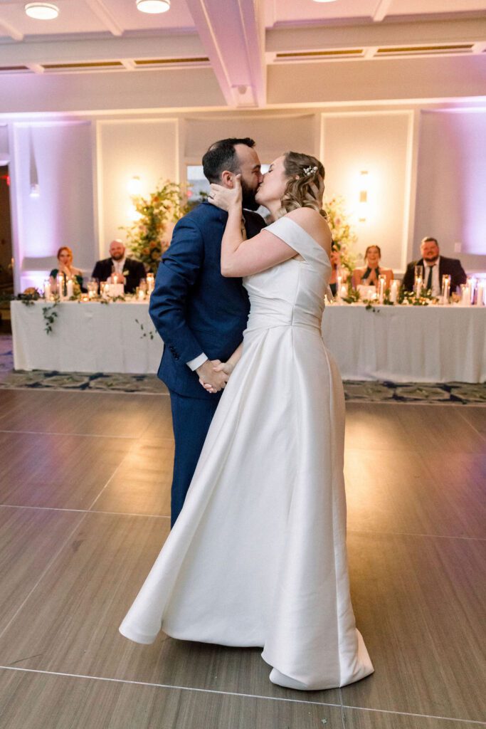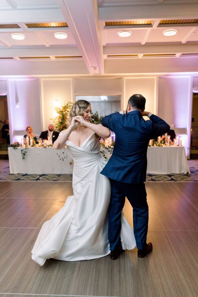 After some yummy cocktails and delicious food, the reception began in the Banneker ballroom downstairs. Their cake included a figurine of their dog Oliver, who had to make his appearance somewhere. Their table numbers were custom artwork, which pictured scenes from some of their favorite movies. For the newlywed’s grand entrance, they recreated the handshake from “The Parent Trap”. Shortly after, they shared their choreographed first dance, designed by Jorge from Yours Truly Dance in NW DC. Impressively, they had learned it just in time, as only weeks earlier, Ellen had sprained both of her ankles. That couldn’t stop her from dancing at her wedding!