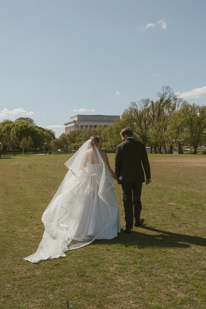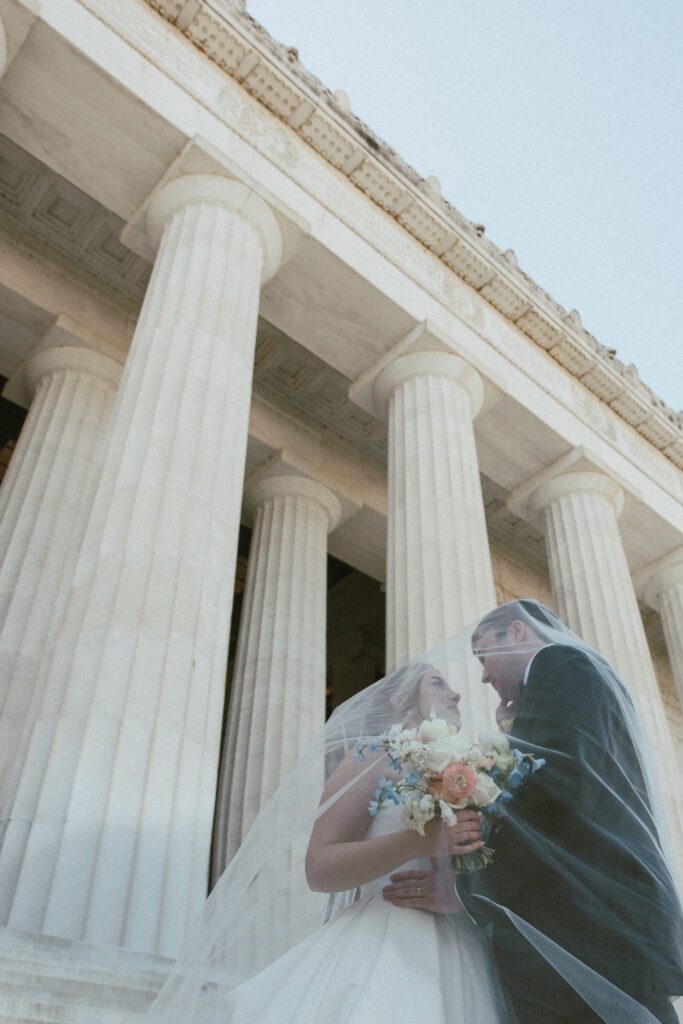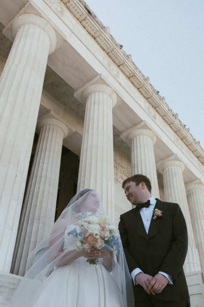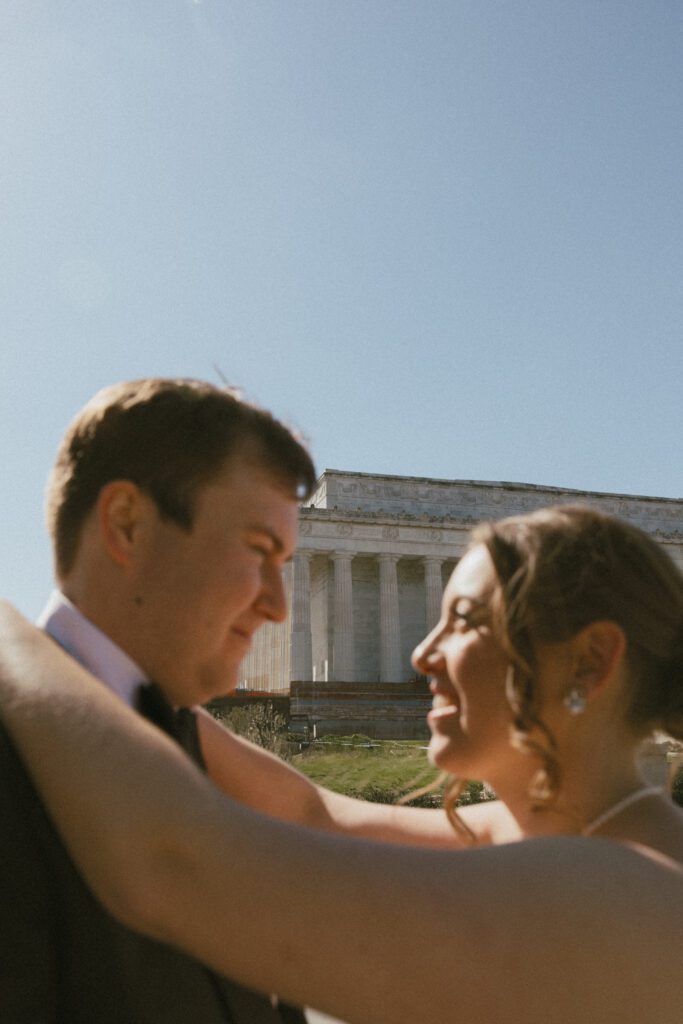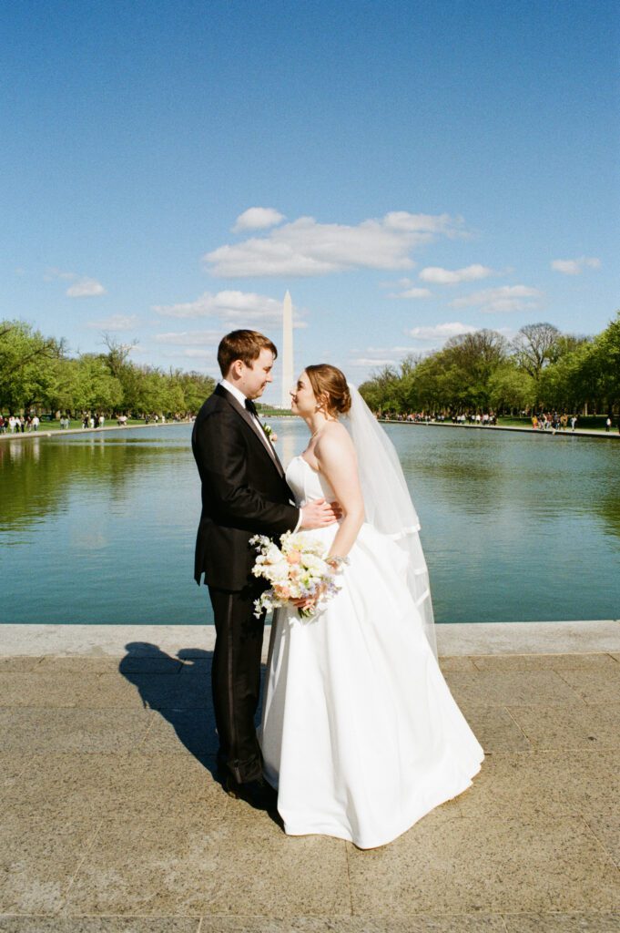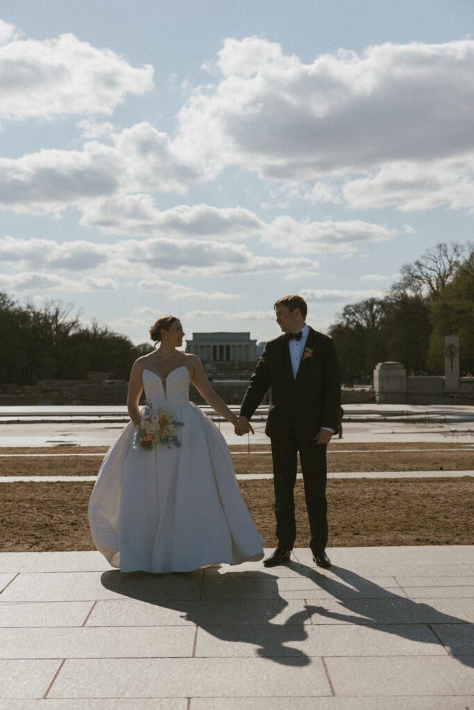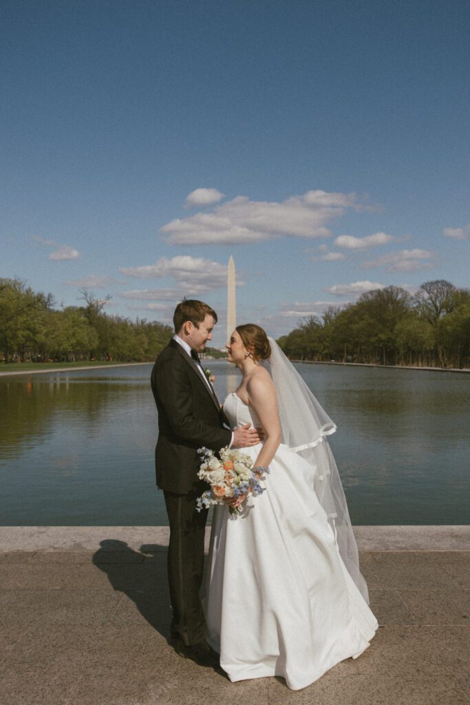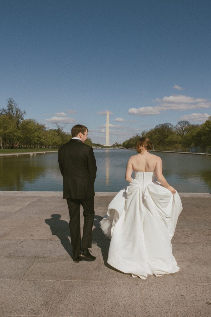 Following the ceremony, the newlyweds soaked in the moments, and the city, by wandering the National Mall for portraits. From the Lincoln Memorial to the Reflecting Pool and the World War II Memorial, their photos captured both the grandeur of DC and their undeniable joy.